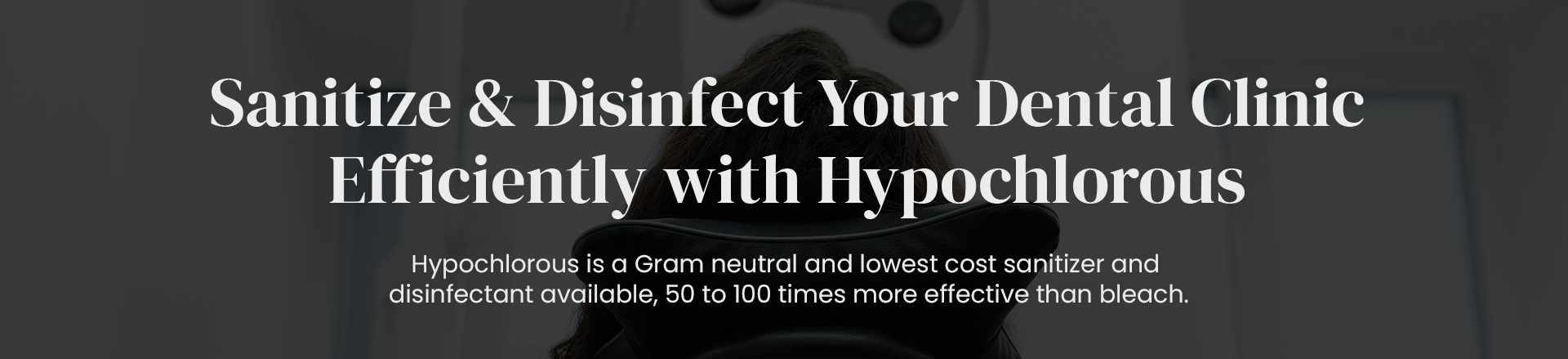 Hypochlorous is a powerful and smarter solution for dental clinics. It is 80 to 100 times more effective than bleach and eliminates 99.9% of bacteria and viruses. Hypochlorous is a go-to solution for dental clinics, used to easily sanitize and disinfect equipment, instruments, floors, ceilings and all high contact areas.